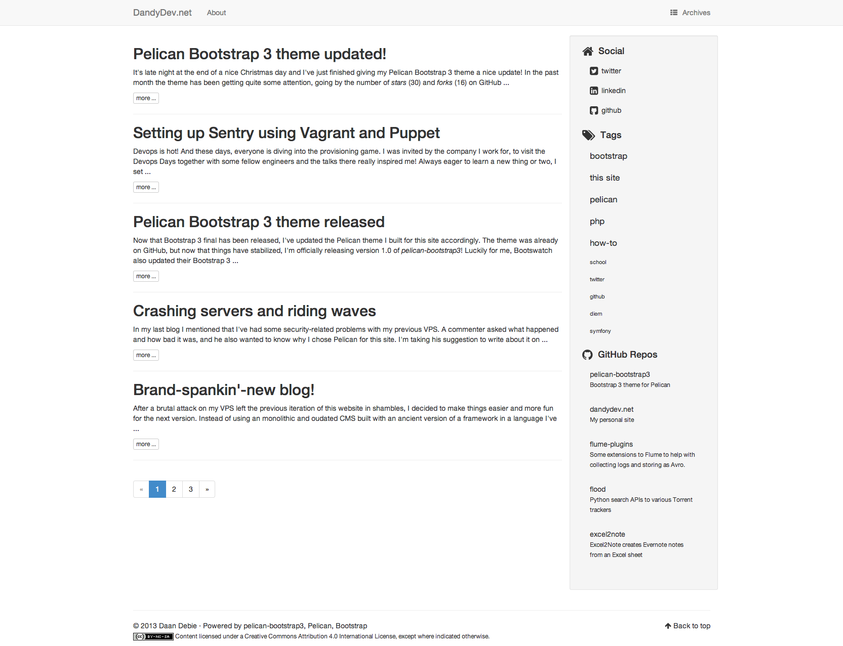 This is a Bootstrap 3 theme for Pelican. It's fully responsive. Bootstrap 3 has seen an official, final release now, so I don't expect any breaking changes anymore. I will try to keep it up-to-date.